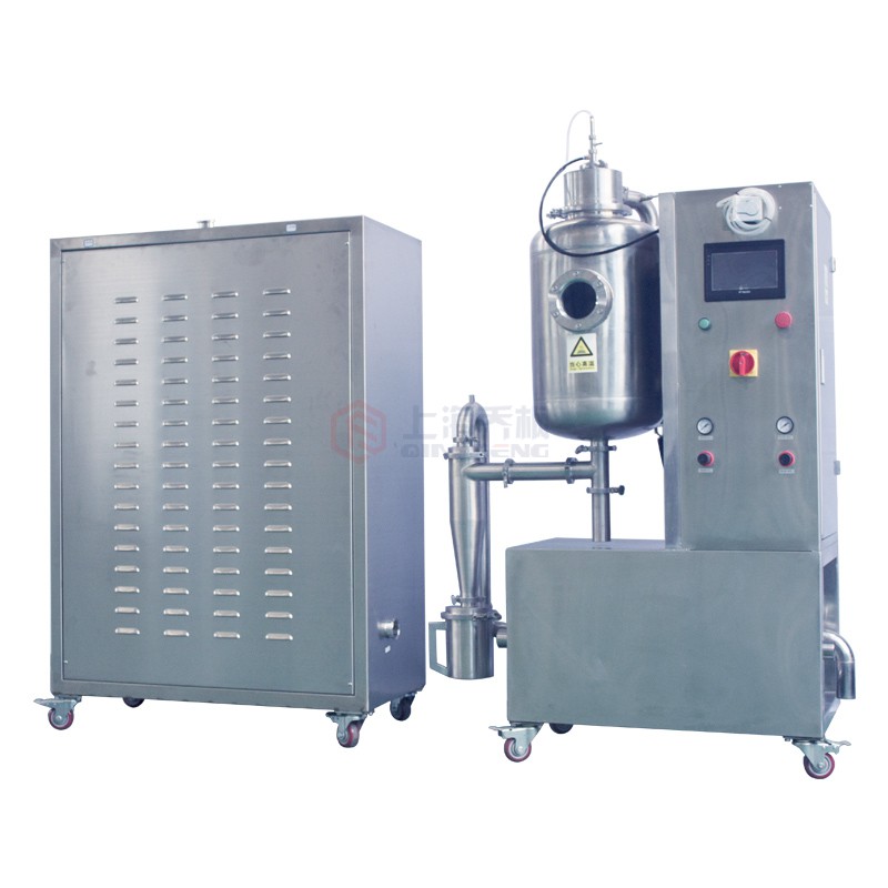 低溫噴霧干燥機(jī)及其主要適用于高校、研究所和食品,醫(yī)藥,化工,企業(yè),實驗室生產(chǎn)微量顆粒粉末,對溶液如乳濁液、懸浮液具有廣譜適用性, 適用于對熱敏感性物的干燥如生物制品、生物農(nóng)藥、酶制劑等,因所噴出的物料只是在噴成霧狀大小霧滴時,才受到干燥風(fēng)系統(tǒng),故只是瞬間受熱,能保持這些活性材料在干燥后仍維持其活性成份不受破壞。該型噴霧干燥機(jī)可以實現(xiàn)在常溫下進(jìn)行噴霧干燥的低溫霧化干燥及高低溫霧化干燥兩用機(jī)型。